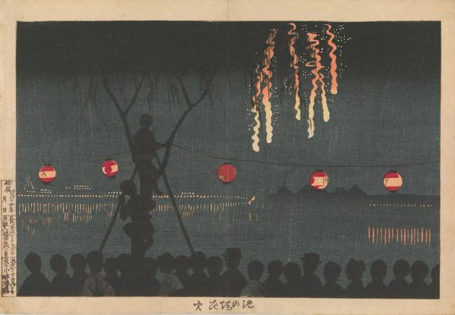 Kobayashi Kiyochika (Japanese, 1847–1915). Fireworks at Ikenohata, 1881 (Meiji 14). Woodblock print; ink and color on paper, 8 × 12 3/8 in. (20.3 × 31.4 cm). Gift of Sebastian and Miki Izzard, 2016 (2016.577)