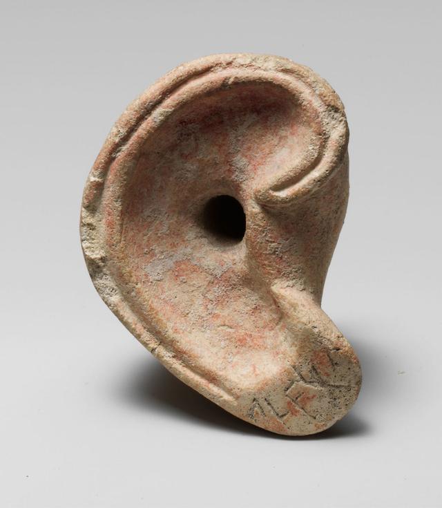 Votive offerings are generally presented to gods out of gratitude or to seek a cure. This limestone votive ear from Cyprus has four syllabic signs on its lobe that read, “I belong to a deaf person.” It’s very likely that that person was asking for a cure as there is a long, long history of people trying to fix deafness.