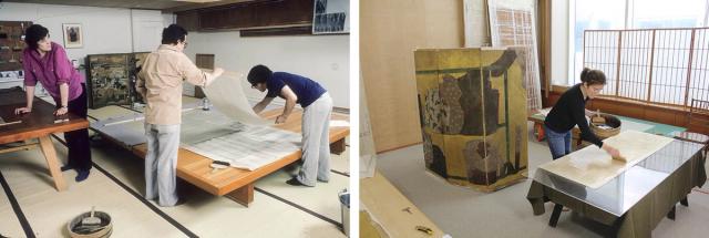 Left: Conservators Sondra Castile, Mitsuhiro Abe, and Takemitsu Oba (from left to right), are seen here in the “high attic,” applying a kozo paper lining to a scroll mounting silk. This photograph dates to around 1985. Right: Conservator Jennifer Perry, Mary and James Wallach Family Conservator of Japanese Art, in 2017, in the East Asian Paintings Conservation Studio, which was relocated to its current location in the Department of Asian Art in 1999 with funding from the C. V. Starr Foundation.